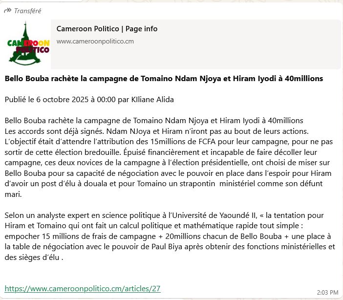 octobre 7, 2025Le Dr Ayissi Yves Patrice, allié de Mme Tomaino Ndam Njoya, publie un communiqué pour démentir formellement les rumeurs selon lesquelles la candidate aurait « vendu » sa campagne à M. Bello Bouba. Il qualifie ces affirmations de fausses allégations visant à discréditer une candidature intègre. Le Dr Ayissi insiste sur la visibilité et la mobilisation réelles de la campagne de Mme Ndam Njoya, affirmant que ses accords politiques reposent sur une vision commune plutôt que sur des transactions financières.