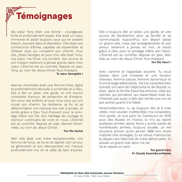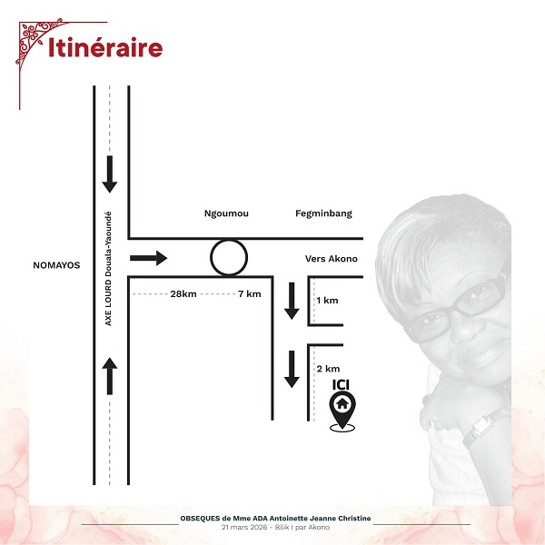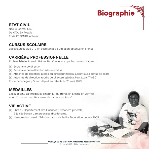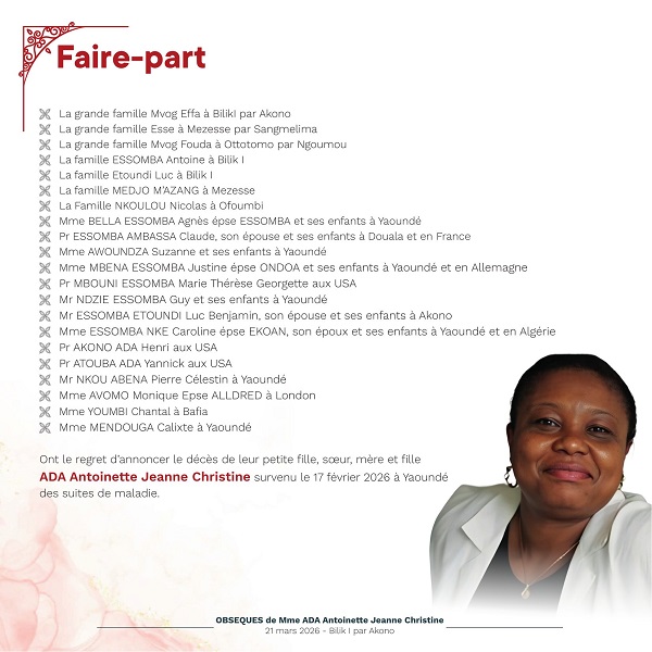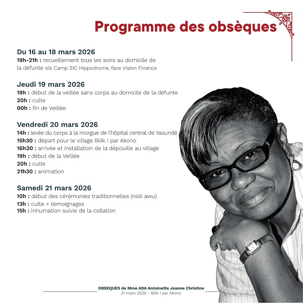 Le dernier hommage La communauté, ses amis et sa famille se réuniront dès ce 16 mars au Camp SIC Hippodrome pour des moments de recueillement. La levée de corps aura lieu le vendredi 20 mars à l’Hôpital Central de Yaoundé, suivie du transfert vers le village Bilik I par Akono, où elle reposera pour l’éternité le samedi 21 mars 2026, comme le révèle le programme des obsèques ci-après: